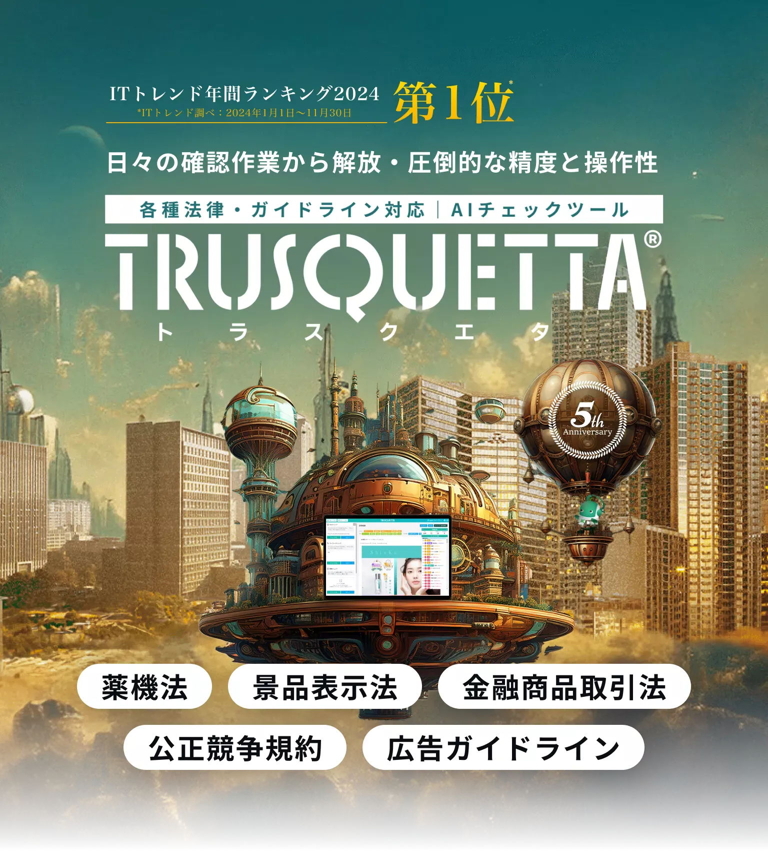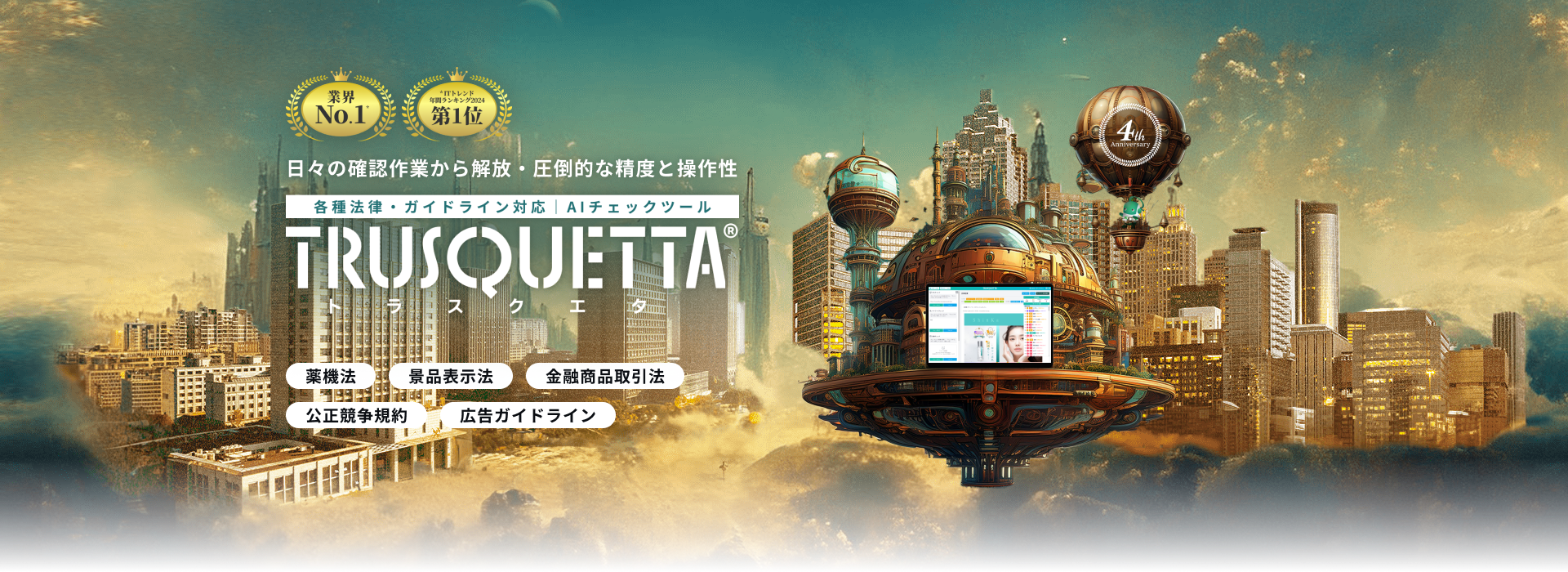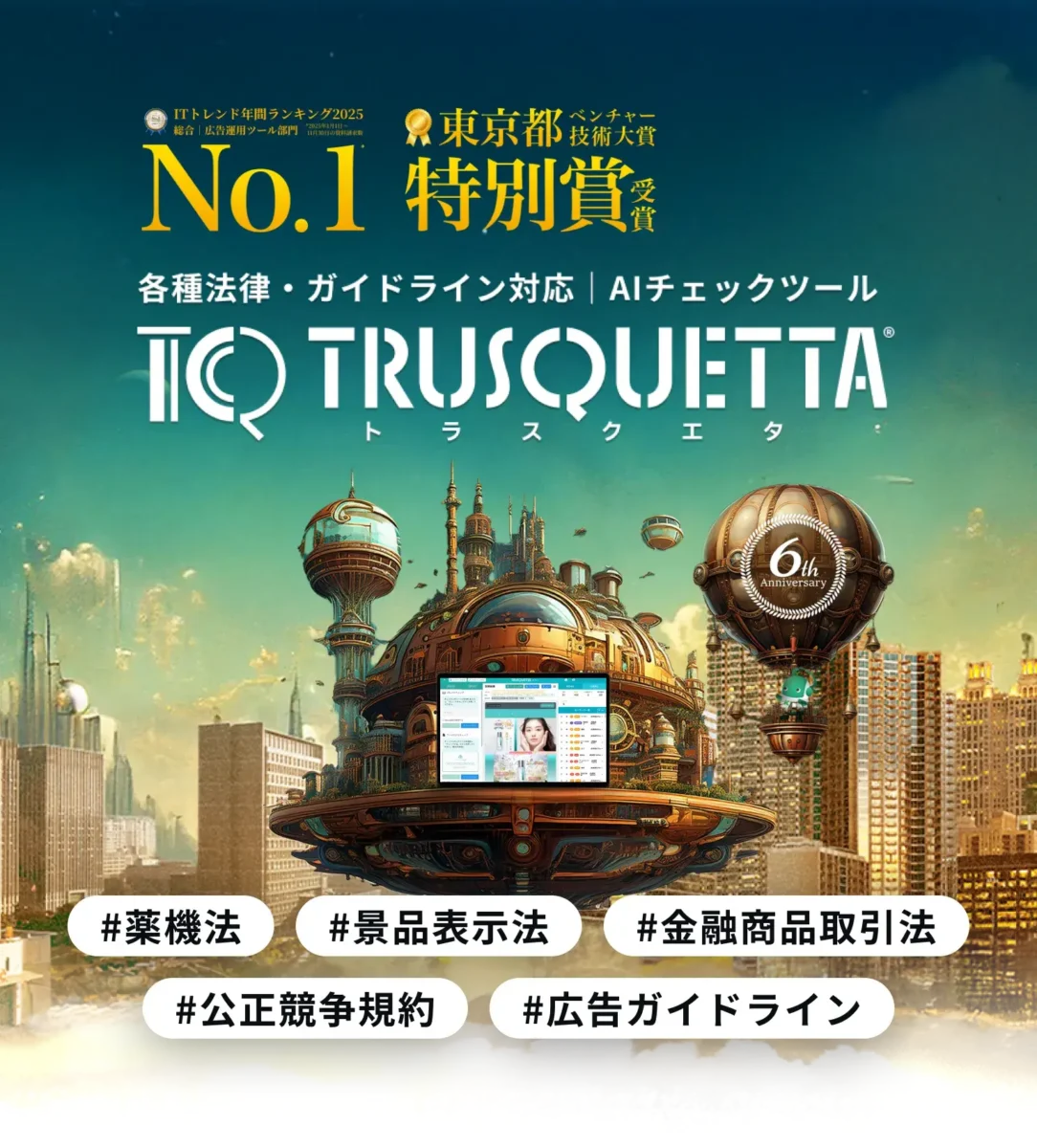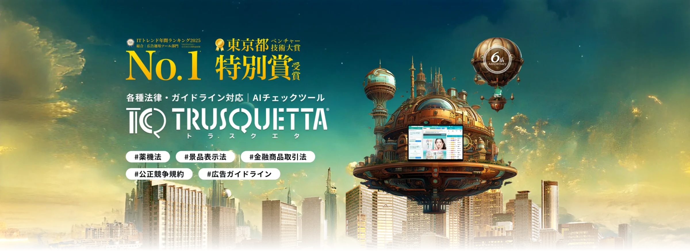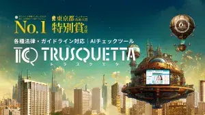 次世代AIレビューシステム『トラスクエタ』は、「あれ?この表現大丈夫かな?」と不安に思った時、辞書的に調べることができたり、誇大表現になる恐れがある箇所をぱっと指摘してくれるサービスです。 AIチェックツールとして様々な法律、ガイドラインデータを蓄積し、4年以上のサービス運営で信頼性向上。おかげさまで多くの企業様にご導入いただいております。